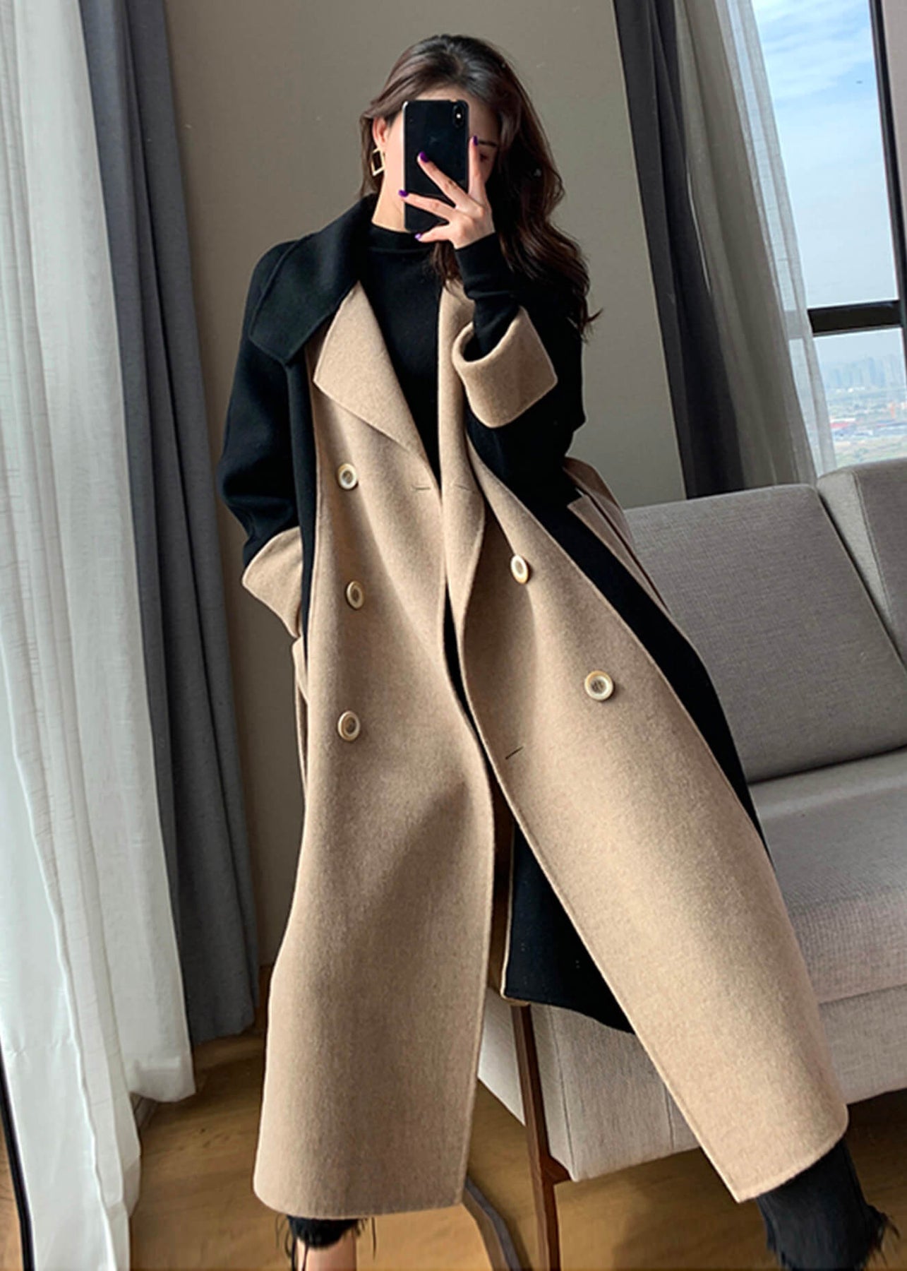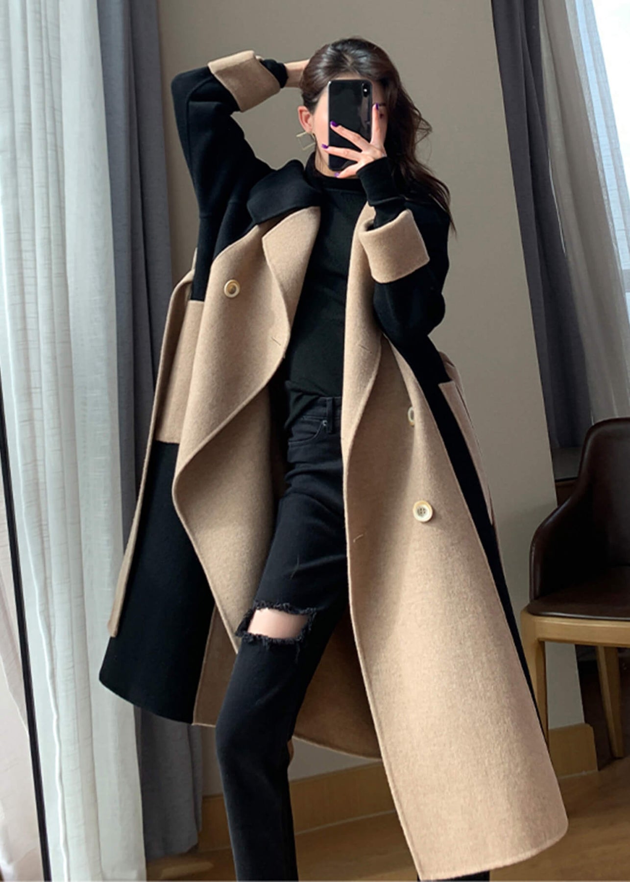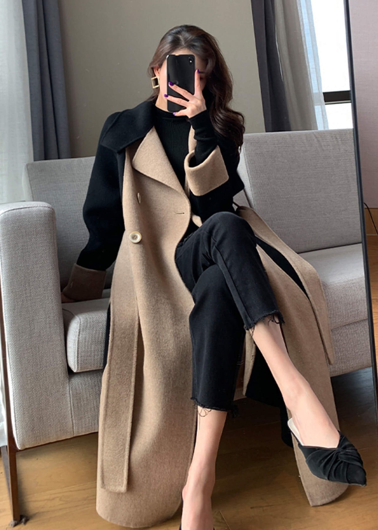 This season-staple coat is superbly sophisticated with its rich wool texture, color block and defining tie belt.