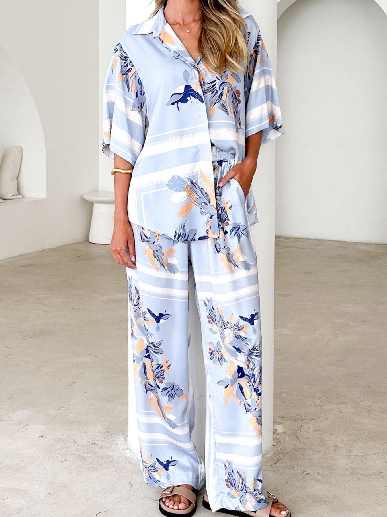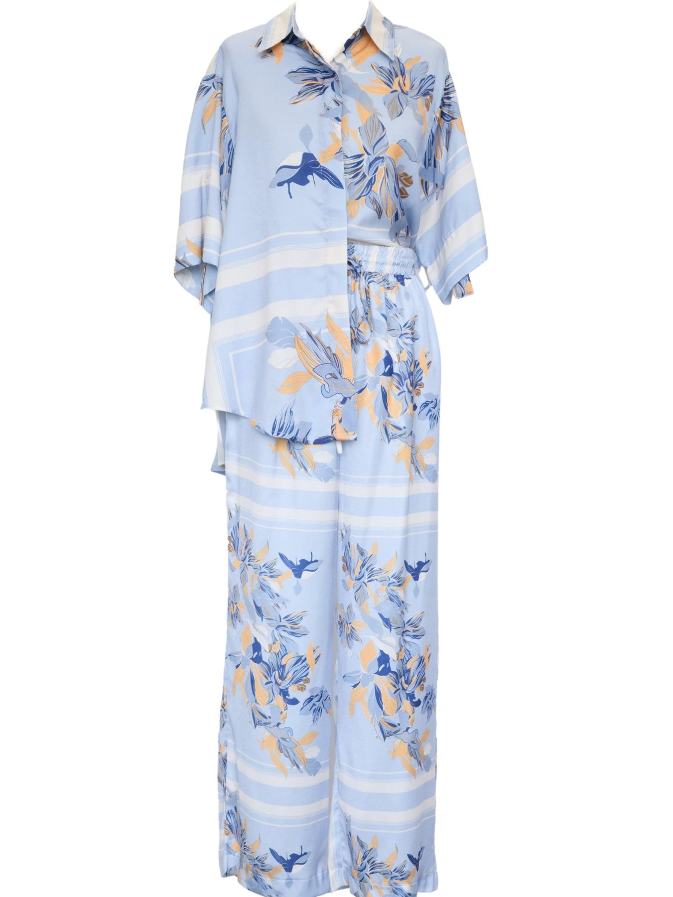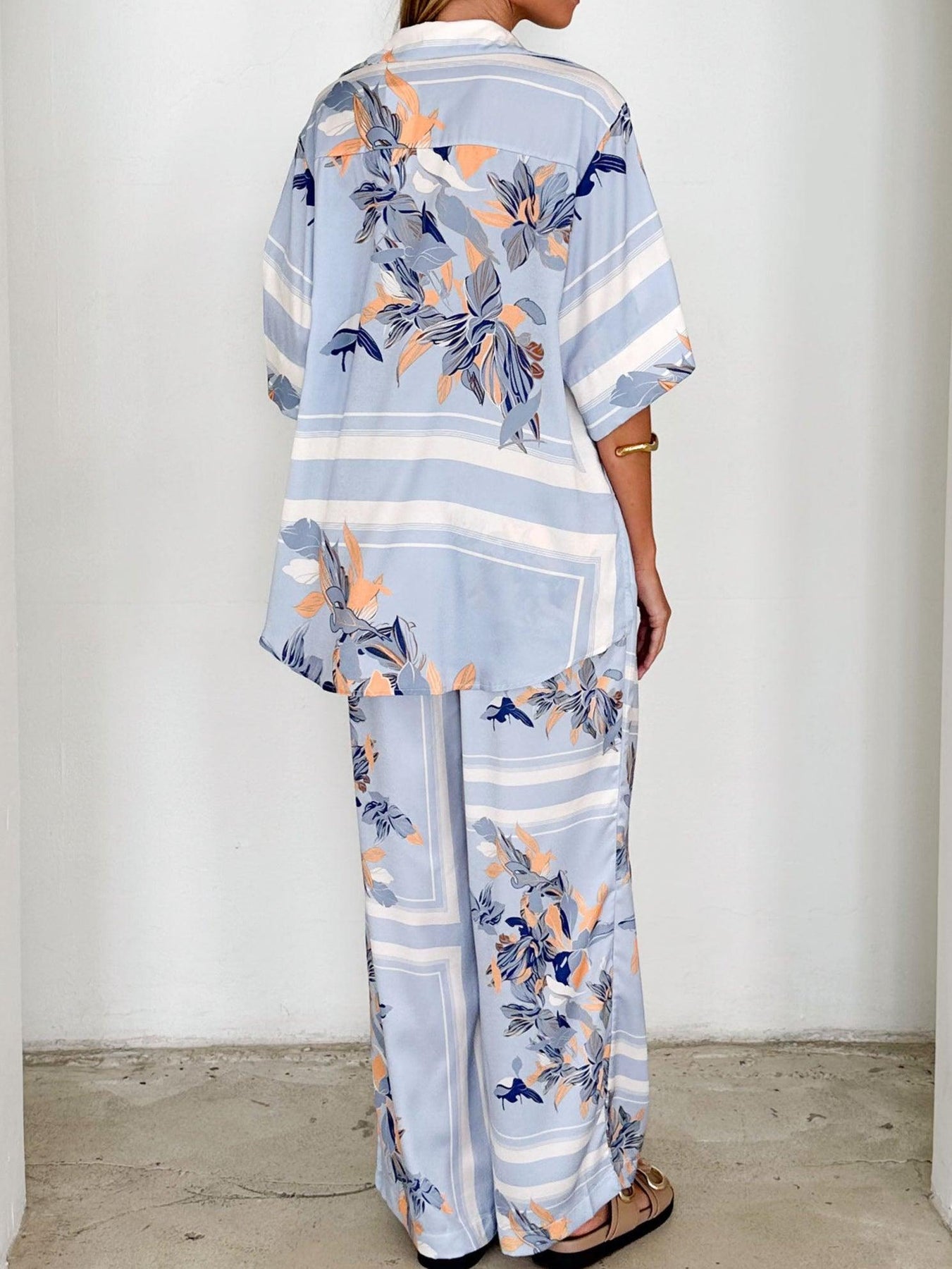 Powder Blue Floral Casual Loose Shirt and Trousers Set