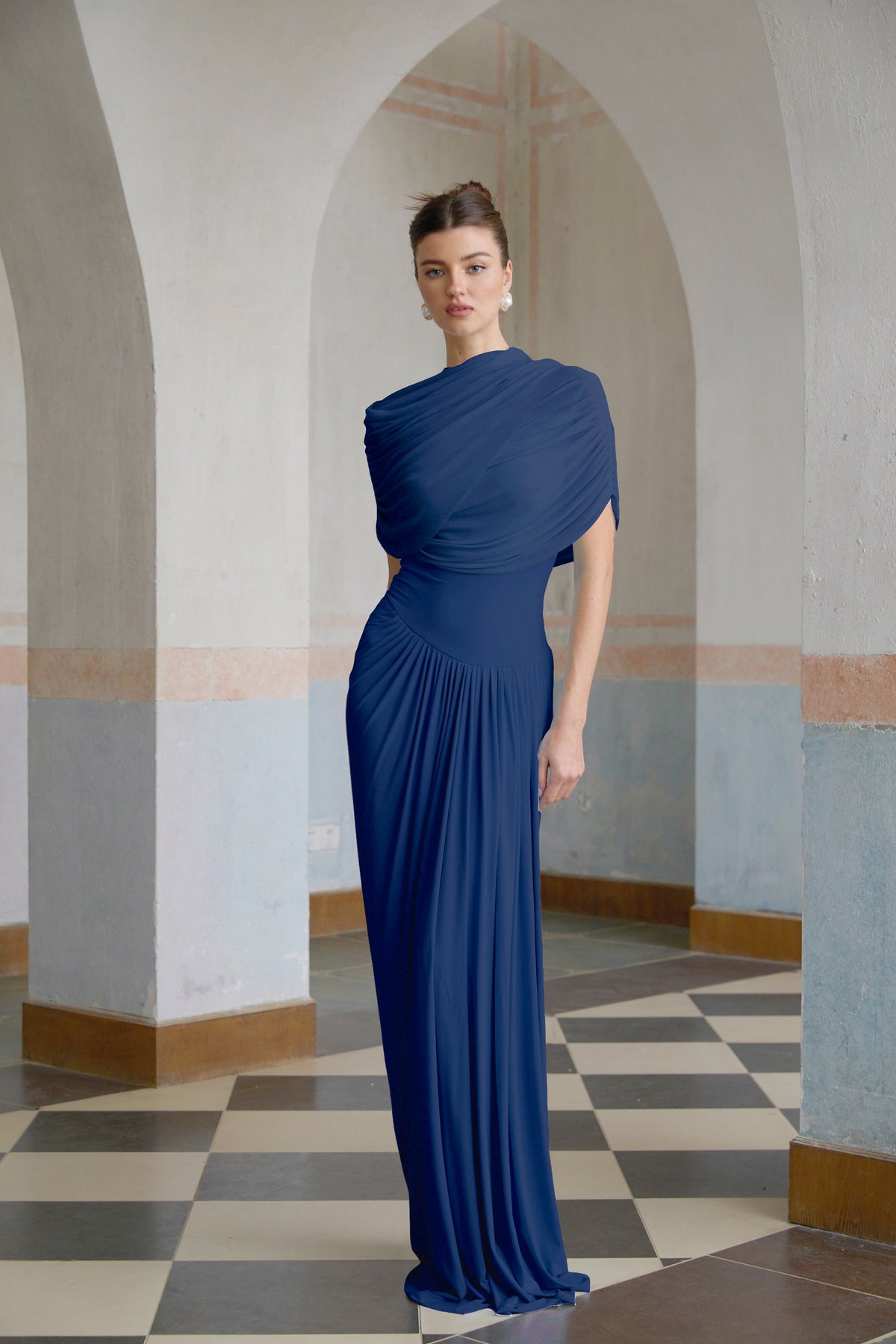 Catherine asymmetrical pleated maxi dress in Navy-blue