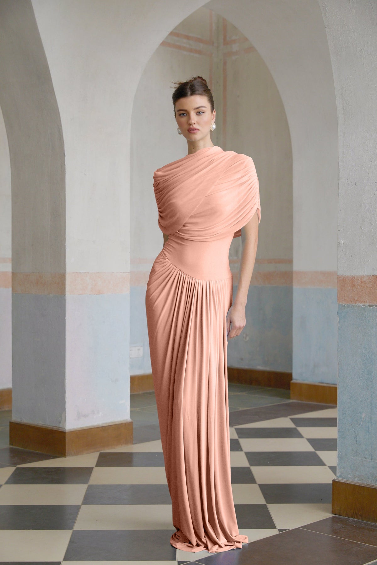 Catherine asymmetrical pleated maxi dress in Pink