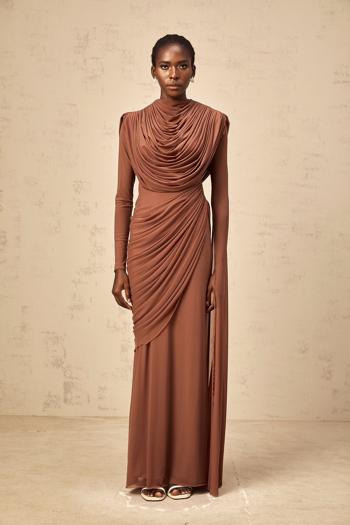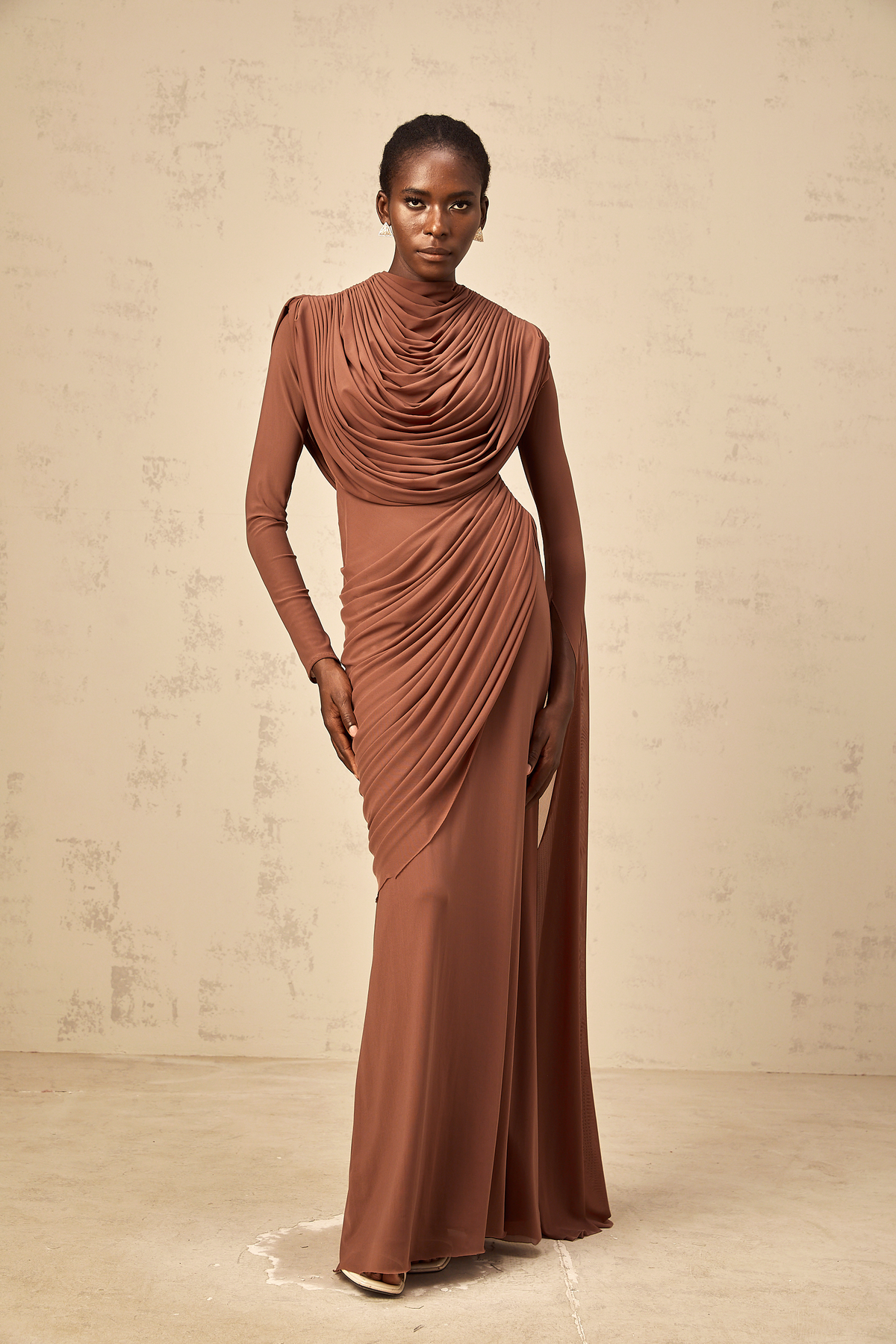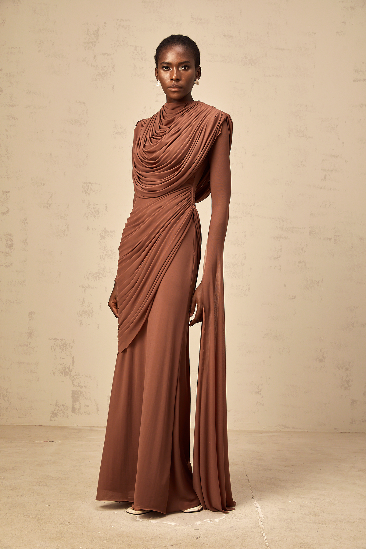 Danaé brown shirred-effect draped maxi dress