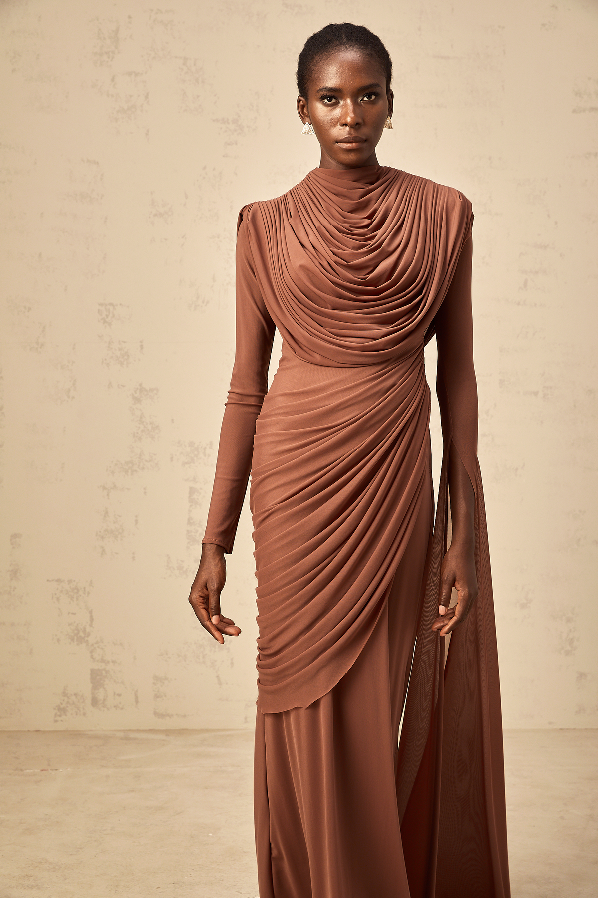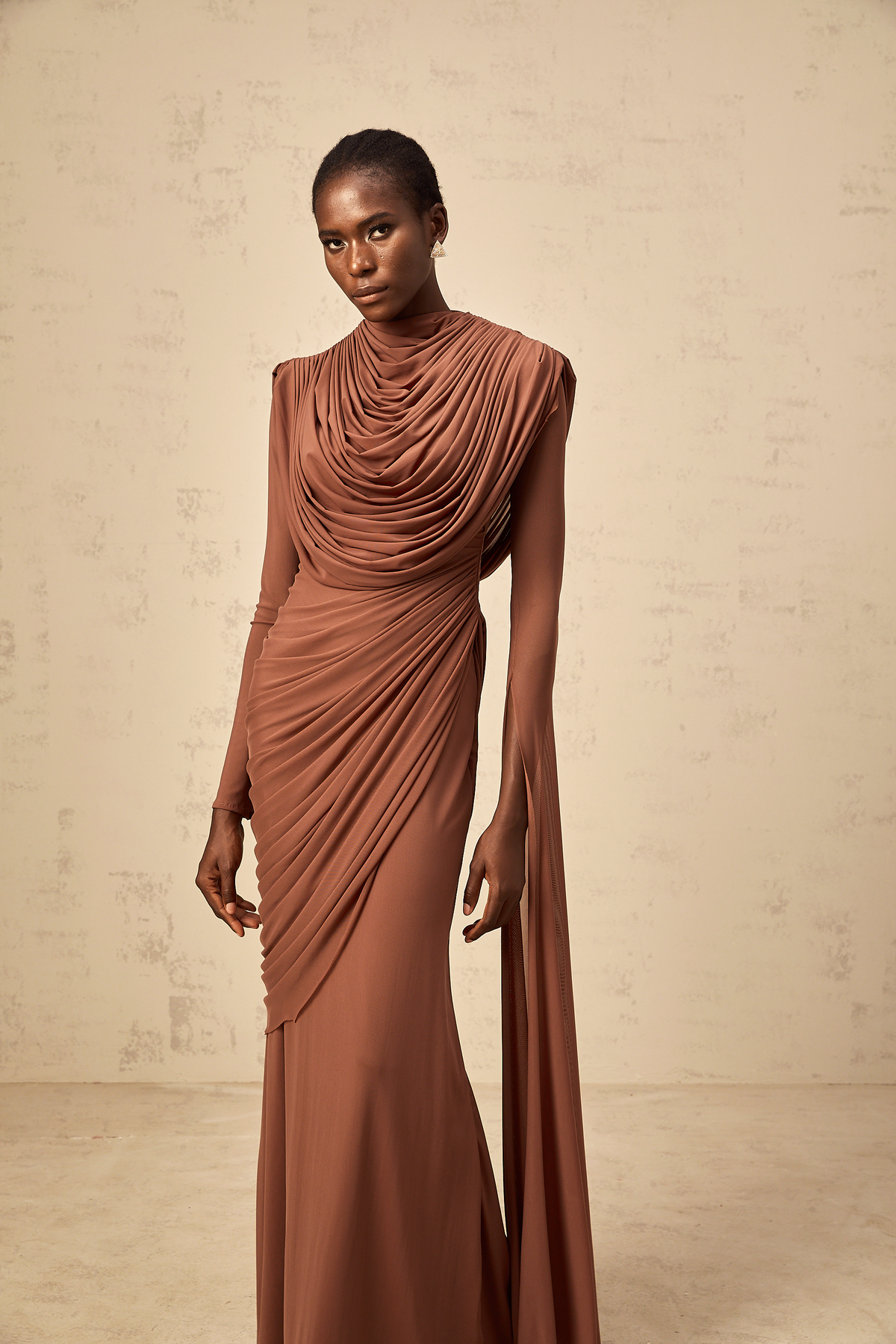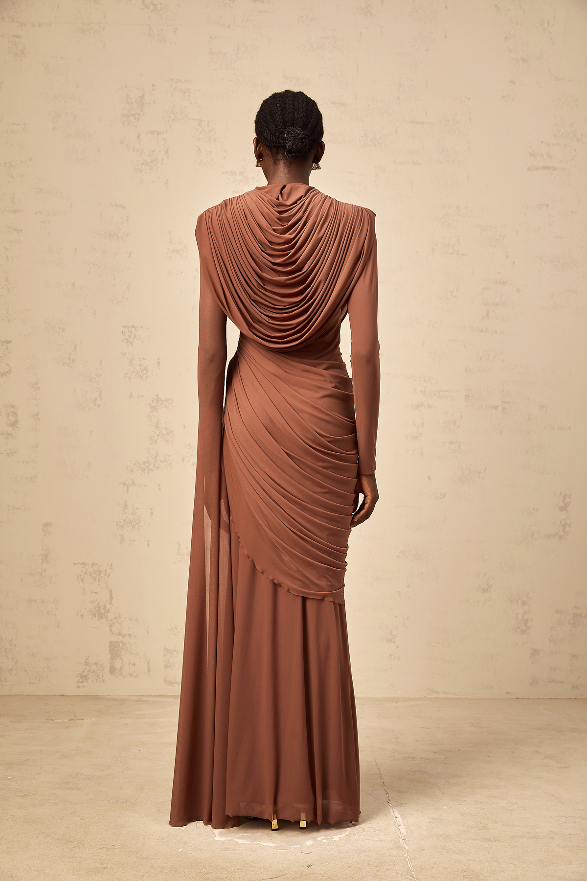 Danaé brown shirred-effect draped maxi dress