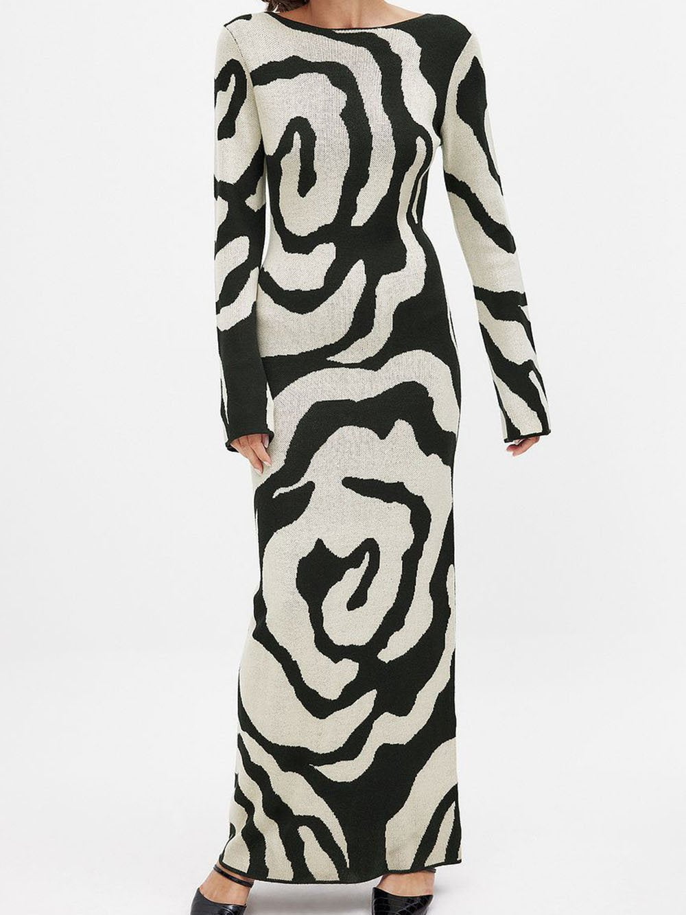 This long dress is made of fine high-stretch knitted fabric, which is soft and comfortable to wear. The unique boat neck design shows the elegant clavicle, and the romantic trumpet sleeves add a touch of retro and smart atmosphere to the overall shape. The skirt is decorated with exquisite jacquard prints, presenting a unique visual effect, while expanding the shining diamond sequins, making the overall shape more luxurious and shining, whether it is daily outings or special occasions, it can easily attract attention.