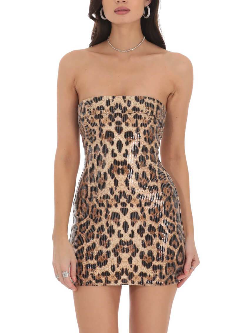 Get a stylish and comfortable look with our Bandeau Sequin Leopard Mini Dress.