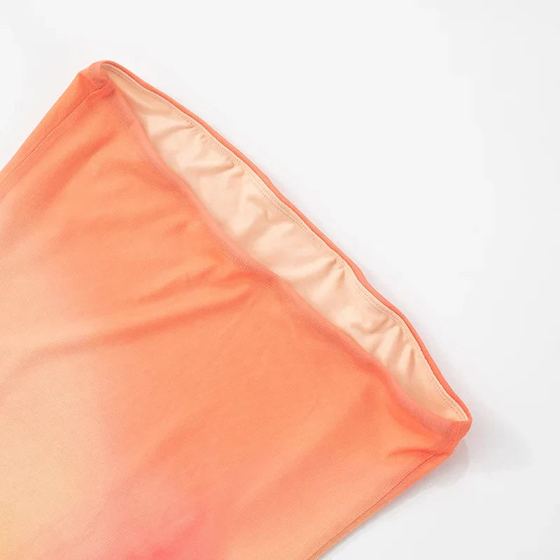 Sunset hues meet minimalist glamour in the VeliaMaxi Dress — a strapless silhouette that feels like a golden hour escape. With fluid color washes in warm orange, coral, and lemon, it clings just right while letting you glide through summer scenes effortlessly.
